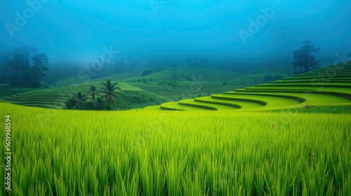 Lush verdant terraced rice paddies cascade down misty slopes under a hazy blue sky