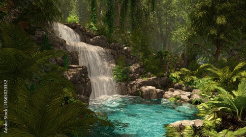 Lush waterfall cascading through a tropical rainforest