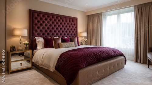 Luxurious Bedroom Interior with Burgundy Headboard and Bedding