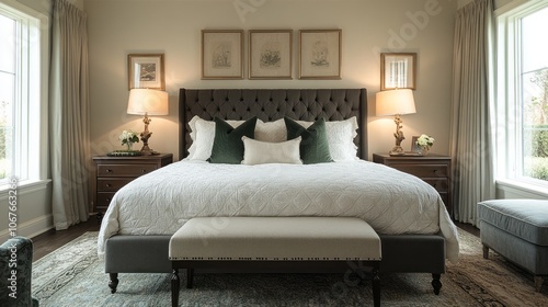 Luxurious Bedroom Interior with Upholstered Bed, Ottoman, and Area Rug