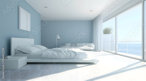 Luxurious bedroom with white tones and panoramic windows.