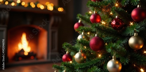 Luxurious Christmas tree with ornaments and twinkling lights against a warm fireplace backdrop, Festive Ambiance, Cozy Living Room