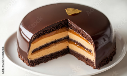 Luxurious dome shaped chocolate cake with caramel layers, showcasing rich texture and elegant presentation. Perfect for celebrations and special occasions