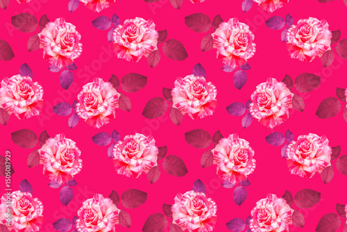 Luxurious garden roses on vibrant pink background.