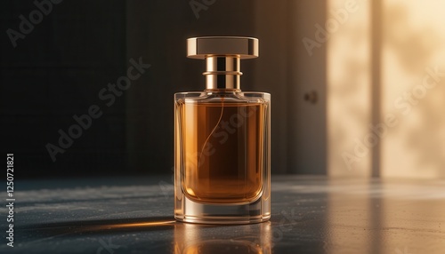 Luxurious Glass Perfume Bottle with Golden Cap in Sunlit Room on Reflective Surface