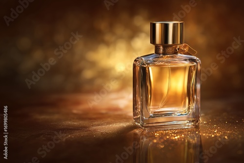 Luxurious golden perfume bottles on shiny reflective surface with elegant warm bokeh light in glamorous studio setting