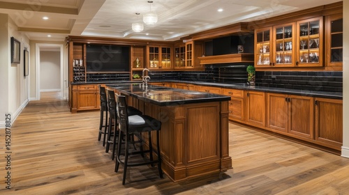 Luxurious Home Bar with Dark Wood, and Granite Island.