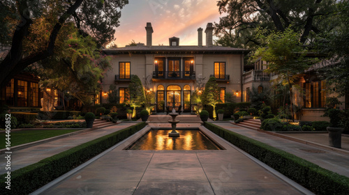 Luxurious mansion with elegant architecture, surrounded by lush gardens and tranquil reflecting pool, illuminated by warm evening light, creating serene and inviting atmosphere