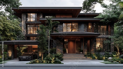 Luxurious modern house with dark stone exterior, large windows, and tropical landscaping.