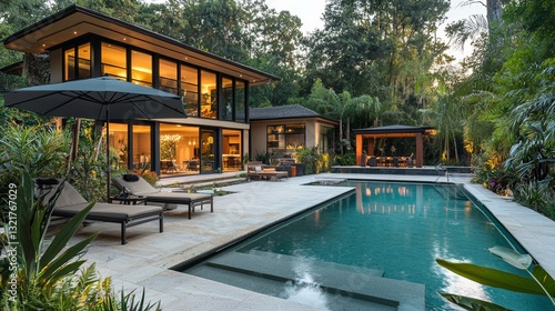 Luxurious modern house with pool, patio and garden in a tranquil setting