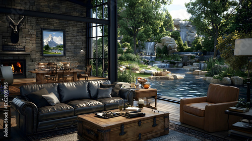 Luxurious mountain lodge living room overlooking serene waterfall garden
