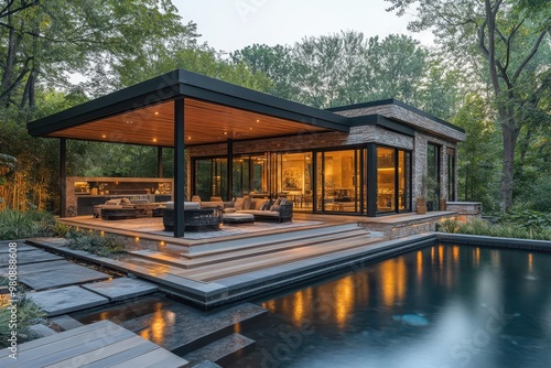 luxurious outdoor living space teak deck with black pergola evening ambiance by illuminated pool stylish lounge furniture lush garden setting