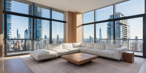 Luxurious penthouse living room, floor-to-ceiling windows, panoramic city skyline view, modern white sectional sofa, wooden coffee table, minimalist interior design, high-rise apartment, sunset light,