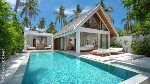 Luxurious villa with a refreshing pool surrounded by palm trees under a clear blue sky, ideal for vacation and relaxation in paradise-like setting