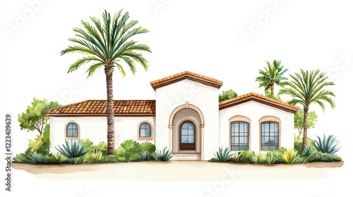 Luxurious watercolor painting of home with palm trees and greenery