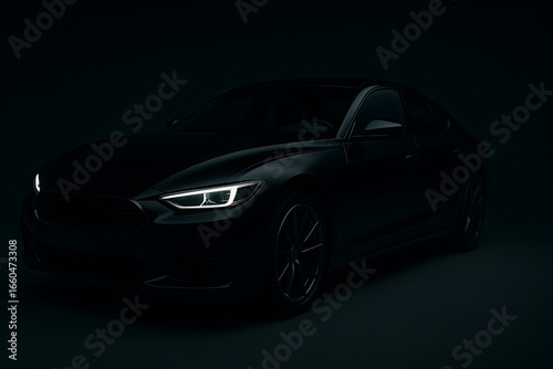 Luxury black sedan car front side view, modern premium automobile with illuminated LED headlights in dark studio background, sleek automotive design, elegant vehicle concept, transportation industry s