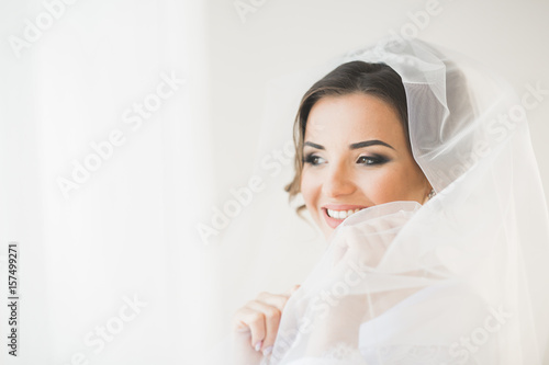 Luxury bride in white dress posing while preparing for the wedding ceremony