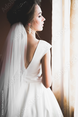 Luxury bride in white dress posing while preparing for the wedding ceremony