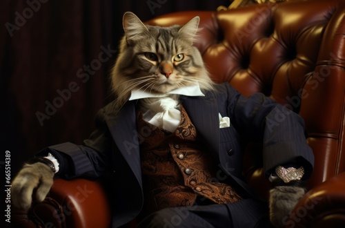 Luxury cat dressed in stylish attire poses on a lavish chair in an opulent interior, symbolizing the lifestyle of the richest and most stylish individuals