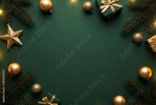Luxury Christmas and New Year background with green texture, golden ornaments, and copy space Elegant holiday frame design with empty space for text, perfect for New Year 2026 greetings and seasonal b
