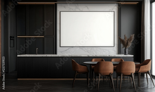 Luxury dark kitchen interior with an empty poster frame mock-up, modern marble backsplash and elegant dining area