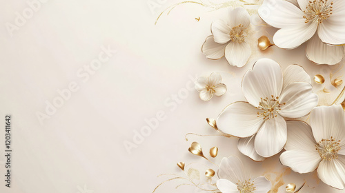 luxury floral wallpaper with white flowers and gold accents on beige background