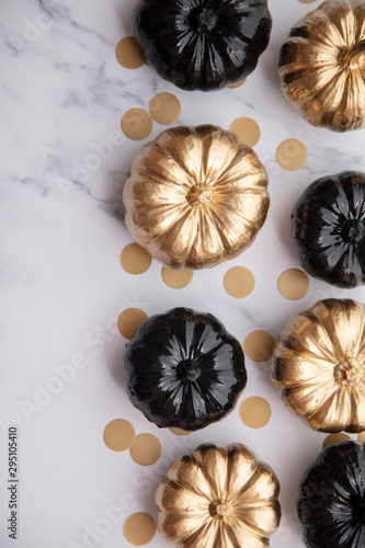 Luxury gold and black autumn pumpkin flat lay composition on a marble background