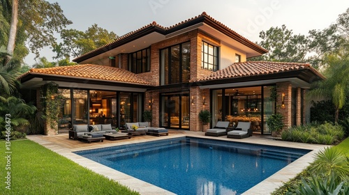 Luxury home with pool, patio, and lush landscaping at sunset.