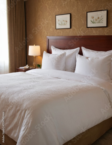 Luxury hotel room, classic bedroom interior. Bed with white plush bedding, wooden furniture
