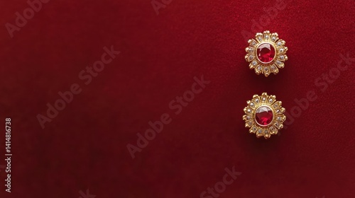 Luxury jewelry flat lay featuring ruby ring and earrings displayed on solid red velvet backdrop