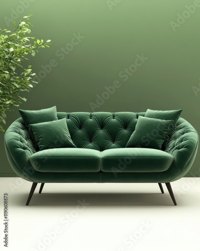 [luxury sofa collection materials] Modern Green Velvet Sofa in Urban Minimalist Living Room with Dark Walls and Potted Plant