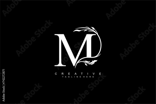 luxury white letter M logo design with beautiful flower and leaf ornaments. monogram M, logo typography. initials M. typography. for business logos, boutiques, companies, beauty, etc