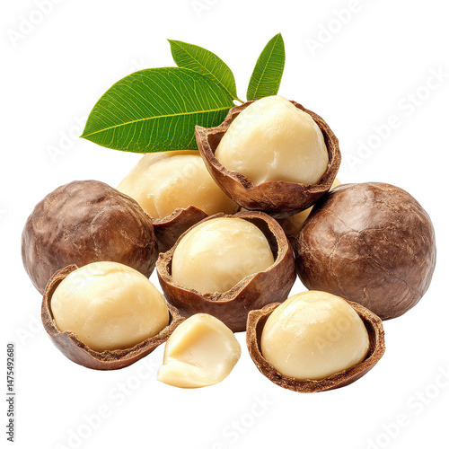Macadamia nuts in their shells with green leaves on a Transparent background, macadamia nuts isolated on PNG background