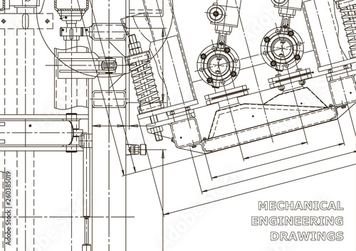 Machine-building industry. Mechanical engineering drawing. Instrument-making drawings. Computer aided design systems. Technical illustrations, backgrounds. Blueprint