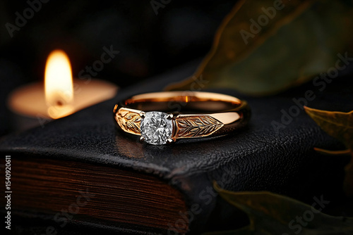 Macro Banner of Vintage Cushion Diamond Ring in Engraved Gold on Leather Book