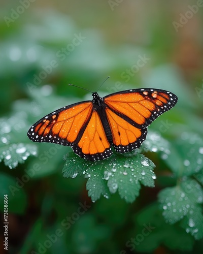 Macro Close Up Of Monarch Butterfly On Green Leaf With Water Droplets
