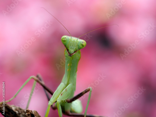 Macro of Praying mantis.Closeup.Pink background.
