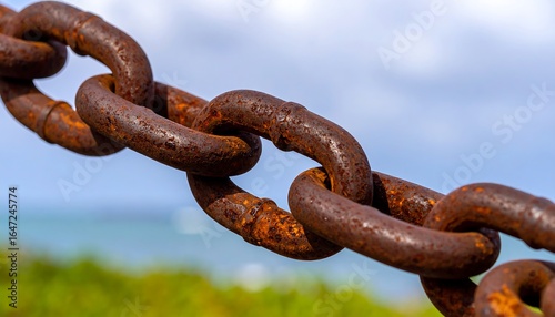 Macro photography of rusted metal chain with seaside backdrop highlighting resilience