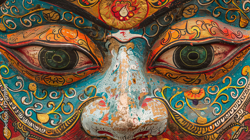 Macro shot emphasizing the intense gaze and elaborate detail in the eyes of a handcrafted Bhutanese mask
