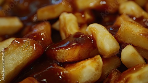 Macro shot of crispy fries, gooey cheese curds, and rich gravy intermingled in a mouth-watering mix