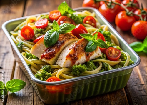 Macro Shot of Delicious Pasta Pomodoro with Pesto Chicken in a Takeout Container for Food Lovers