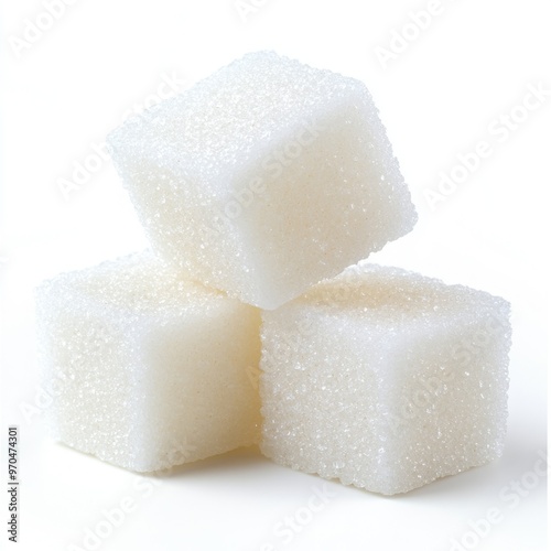 Macro view of three refined sugar cubes on clean white background