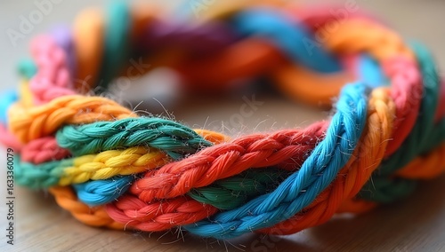 "Macro view of vibrant multi-colored braided threads – used in friendship bracelets, ethnic textiles, or creative crafts, showing playful color harmony."