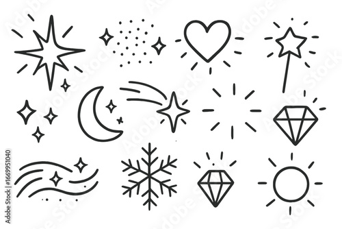 Magic Doodle Sparkles. Hand-drawn doodle illustration glitter effects sparkle burst, glitter dust, star, twinkle, shining heart,