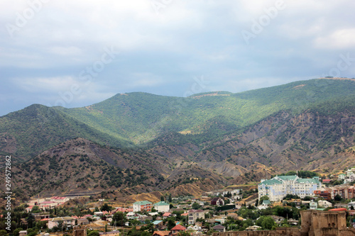 magical beautiful green wooded mountains and blue sky and a small town or village at the foot of the mountains in valley