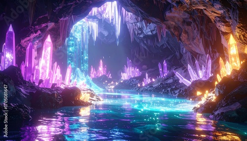 Magical Crystal Caves with Glowing Waterfalls.