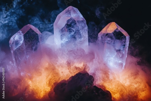 Magical crystals emerging from fiery clouds, mystical fantasy landscape