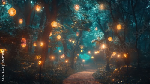 Magical Forest Pathway Illuminated by Enchanting Lanterns and Ethereal Glow