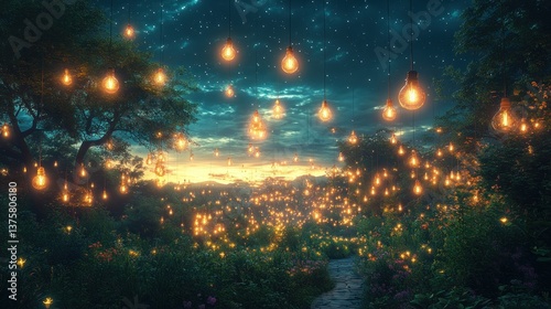 Magical garden path at sunset, glowing light bulbs