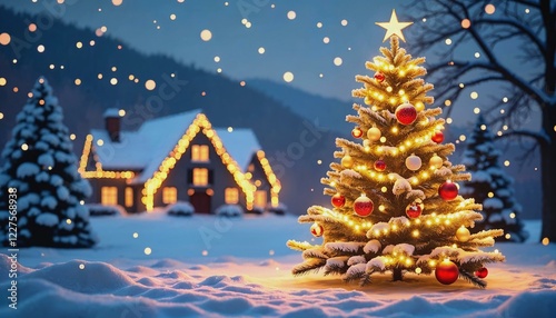 Magical holiday scene with glowing Christmas tree in snowy winter landscape